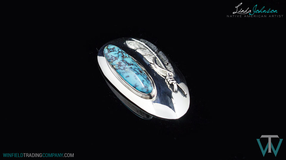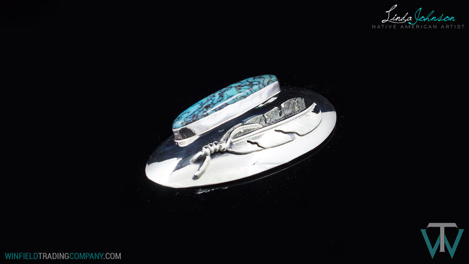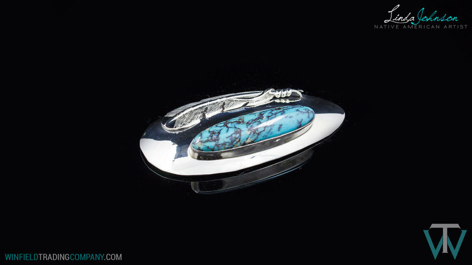 A Clean Dome style Pin with Feather accent and Redskin Turquoise