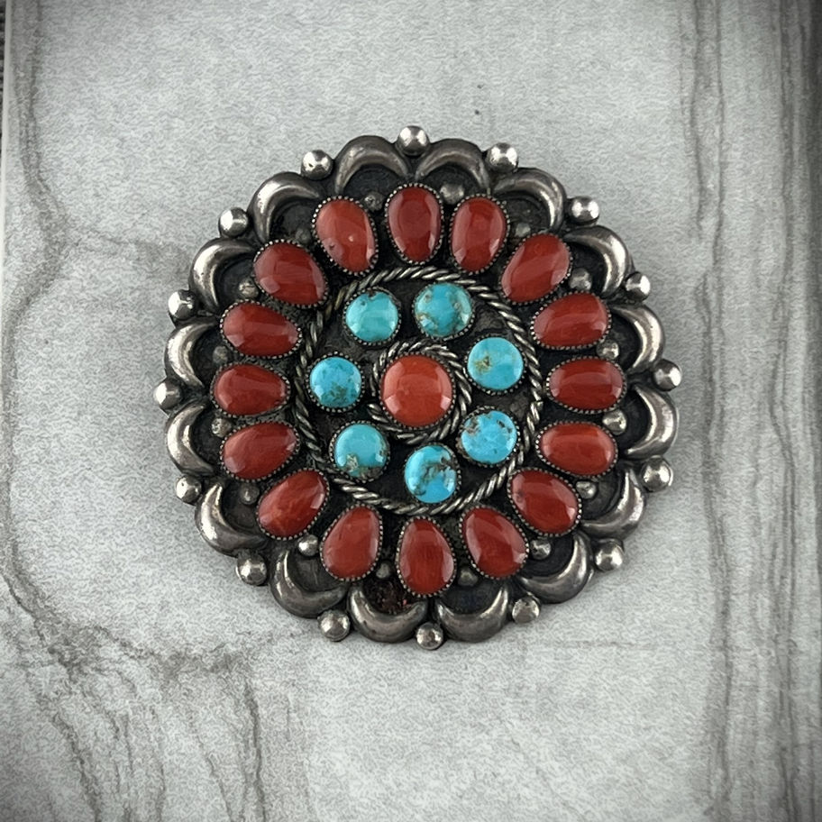 Attributed to Fannie Weebothee Ondelacy Vintage Lone Mountain and Coral Pin.